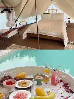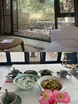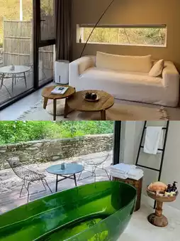 2️⃣The environment is beautiful! The rooms are built in wabi-sabi style against the mountain. The winding modern architecture blends into the lush green embrace of the mountains and forests. There is also a unique tent experience, with two or three benches lazily placed outside the glass room, where you can quietly enjoy a sunrise🌅.