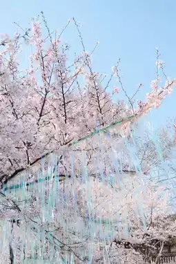 The spring breeze blows, and the ribbons and cherry blossom petals dance in the wind.