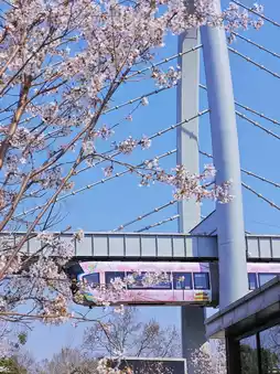 The skytrain arrives every few minutes, and from the windows, you can watch a cloud-like sea of white cherry blossoms.