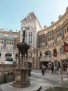 The whole area is a mix of five different European architectural styles, all lined up along one long, vibrant pedestrian street: