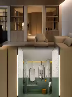 The suite you will stay in is equipped with 270° panoramic floor-to-ceiling windows, and the tatami tea table faces the misty Ganlu Mountain. It has its own private courtyard surrounded by bamboo forests, and a bluestone path connects to the outdoor hot tub. The rooms are equipped with standard floor heating and smart home systems. The bath products are from a niche naturalistic brand, and the bathrobes are decorated with Yangxin cloth stickers, a Hubei intangible cultural heritage craft.