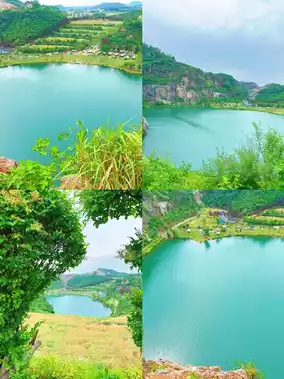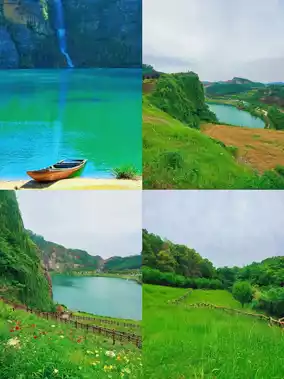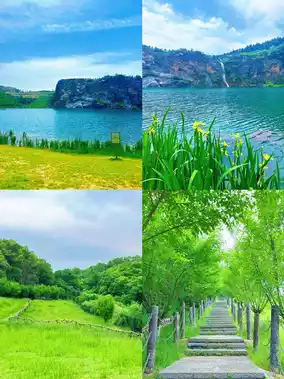 A blue lake transformed from a mine pit. The lake water is blue-green due to minerals. The lawn by the lake is suitable for camping and picnics.