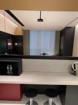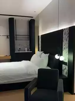 ▪️The hotel is a Bauhaus art container hidden in the bustling city, with a black, white, and gray base clashing with vermilion and emerald green accents.
