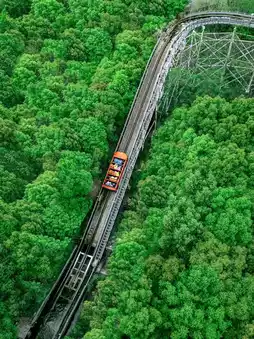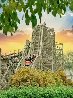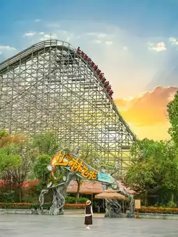 A roller coaster for speed enthusiasts! 91km/h, 1060m, experience the rapid ascents and descents on a wooden track, with a retro look as if traveling through prehistoric times