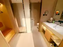 The bathroom features a separate wet and dry design, and the shower area is equipped with high-end shower facilities with multiple water outlet modes for a comfortable shower experience. The bathroom also includes brand-name toiletries, soft towels, and bathrobes to provide guests with attentive service.