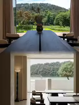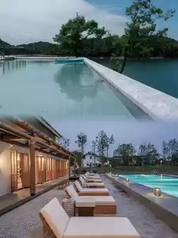 The infinity pool visually merges with West Lake's surface - perfect for summer swimming and transforming into a mirror-like water feature in winter. The book-tea lounge houses extensive collections on landscape painting and classical literature, hosting regular poetry readings.