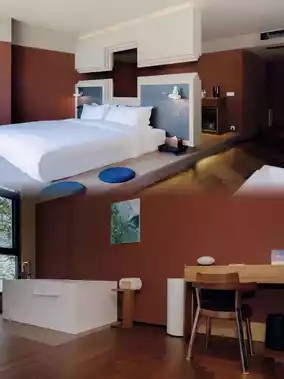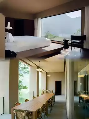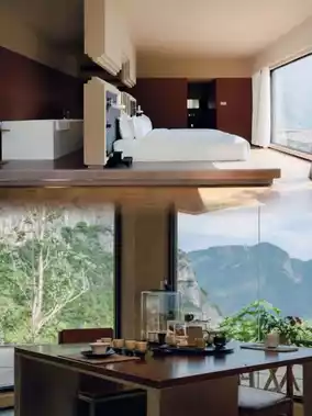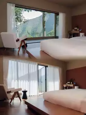 Only 18 rooms exist❗, including mountain-view⛰️, cliff-view🌄, and private villas🏡. Spacious from 60㎡ upwards💥, like the "Wuyun" suite with 270° floor-to-ceiling windows🌌, a 4.8m-wide balcony🌅, and Italian M&D smart curtains to toggle between sunrise and starry modes🌅🌃. Bathrooms feature volcanic rock tubs facing the Goddess Peak🛀, where you can watch riverboats glide through emerald gorges like miniatures🚢! All rooms have AC, floor heating, dehumidifiers, Geneva sound systems🎵, mini-fridges🧊, bathtubs🛁, Dyson hairdryers💨, tea sets🍵, and custom scents. Villas add private living rooms🛋️!
