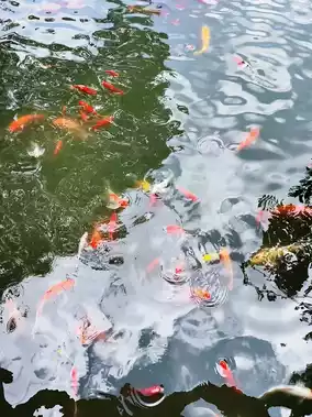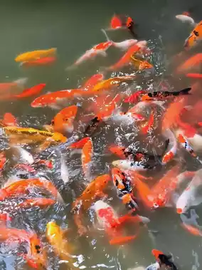 Colorful koi fish swim in groups in the pond