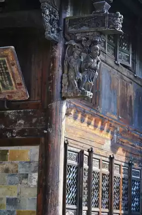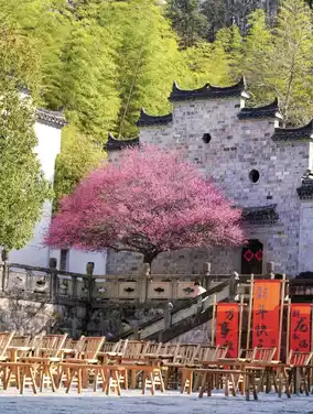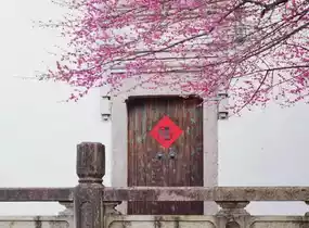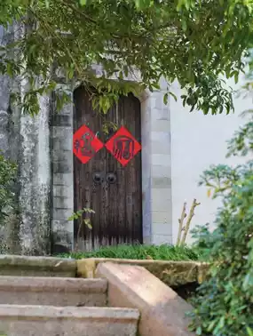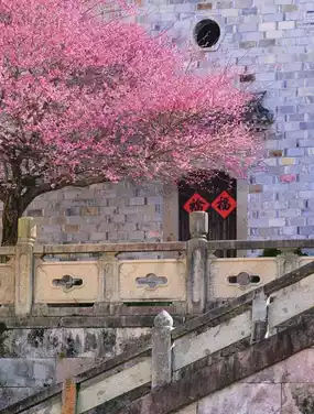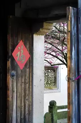The low-key ancient residences are where the plum blossoms are blooming most lively, especially in front of the round arched door where a tree of red plum blossoms flourishes.