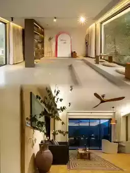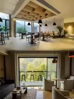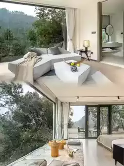 This homestay is located here, on a cliff, surrounded by dense trees, as if isolated from the world. The exterior adopts elements of white walls and black tiles from Jiangnan water town architecture, retaining the rustic and original feel of traditional rammed earth houses. Large floor-to-ceiling windows are used extensively, connecting the indoor space with the outdoor natural environment.