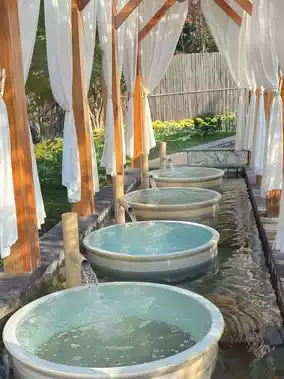 Each room has a private hot spring, with pools hidden in courtyards or on private balconies. The courtyard and small courtyard hot springs are open-air, offering unobstructed views of the starry sky and accommodating 3–4 people at a time.