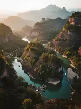 ▫️Bamboo Raft on Nine-Bend Creek: Drift on a bamboo raft in autumn, with Danxia landforms on both banks dressed in autumn colors and water as green as jade.