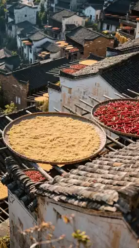 - Huangling’s Sun-Drying Autumn: Colorful crops on rooftops—a quintessential Chinese aesthetic.