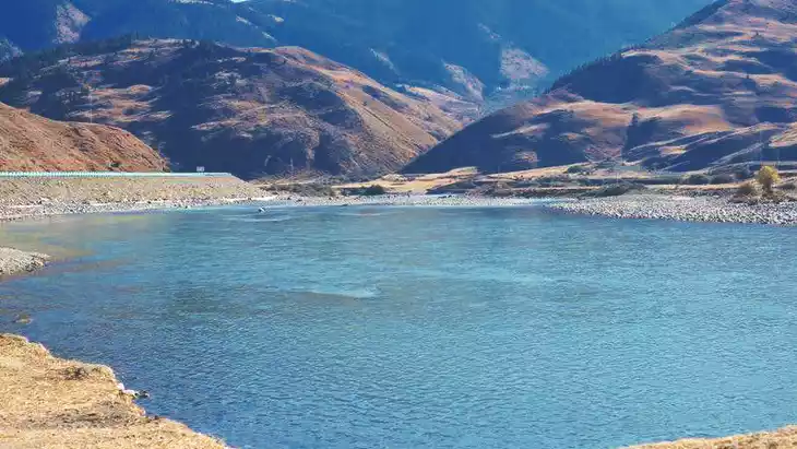 The riverside trail meanders gracefully, flanked by swaying trees that seem to guard this peaceful haven.