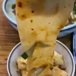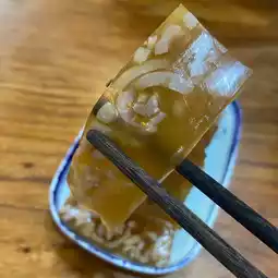 The jelly skin is icy and cool, with a smooth and chewy texture. It has only a light salty taste when eaten alone, but it has a richer flavor when paired with a special sauce, giving a refreshing and appetizing feeling.