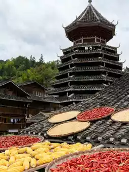 Here, autumn is synonymous with the warmth of daily life. The Dong people dry chili peppers and corn under eaves, with the "gilded" blue tiles and distant green mountains forming a unique painting. Wear a new Chinese-style cotton-linen suit in elegant bean green or moon white. At the drying racks in front of the drum tower, hold a bamboo basket as if picking crops, using side light to capture the texture of clothing and the color layers of the harvest. Afternoon often brings "passing cloud rain"; carrying an oil-paper umbrella can both shelter from rain and serve as a prop. Close-ups of raindrops falling on the umbrella add liveliness.