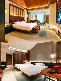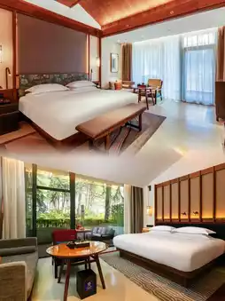 - Garden-view bathtub king room: 180-degree floor-to-ceiling glass facing the courtyard, smart curtains open to a sea of green. The 2-meter king bed is super comfortable, with just the right mattress firmness, making it hard to get up every day.