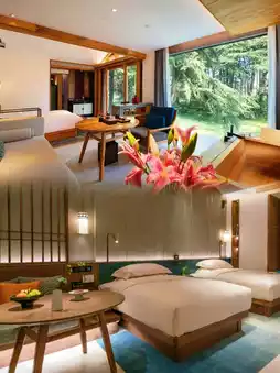- Room windowsill: the garden-view rooms have floor-to-ceiling glass facing the cedar forest; morning sunlight filters through the branches, looking like a painting