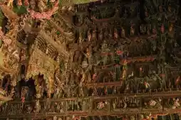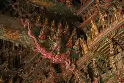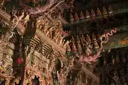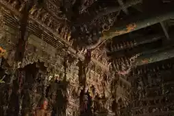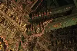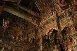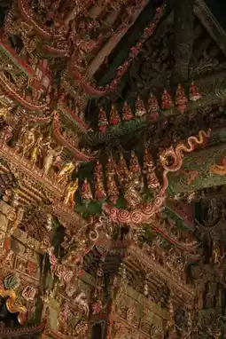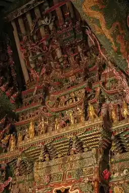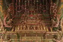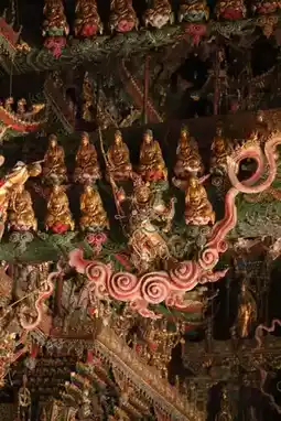 Atmosphere Fully Charged: The hall is dimly lit, with only natural light filtering through doors and windows, shining on the gilded sculptures, adding to the mysterious, solemn, and inviolably sacred atmosphere. The air is filled with the scent of aged wood and incense, as if time has frozen here.