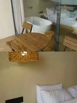 - 🌊 The room is cozy and comfortable to live in. It has a 270-degree curved floor-to-ceiling window, log-style decoration design, a large bathtub with a view, and a super-clear giant-screen projector. You can watch a movie while taking a bath. It's so comfortable!