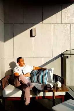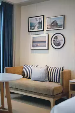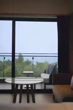 From the moment you step into the lobby, the calm tones and warm natural materials create a transparent and comfortable atmosphere. The rattan and wood decorations complement the blue sea view outside the window.