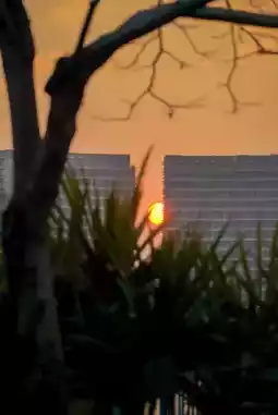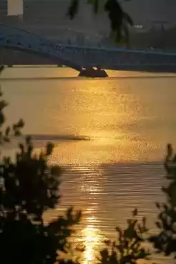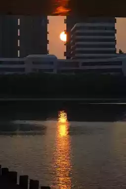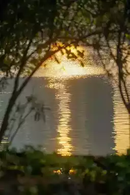 The setting sun slowly sinks to the west and the afterglow falls on the lake