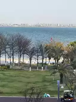 We leisurely strolled around the Seven Star Bay Hotel in the afternoon. The hotel's luxurious European-style design truly gives the impression of being in Europe. Relaxing on the terrace with the sea breeze and gazing at the endless beach is incredibly soothing! The surrounding hotels and European-style architecture became the highlight of our photo session—everything was so photogenic. At dusk, you can sit on the grass and enjoy the sunset; the scenery is absolutely stunning.