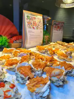 As soon as you enter the restaurant, you’ll see tables piled high with oysters—steamed, garlic-grilled, cheese-baked, truffle-roasted, and more—each one plump and juicy, delivering pure bliss with every bite.