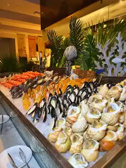 The seafood section is stocked with fresh shrimp, crab, and mussels, all generously sized and ultra-fresh. The sashimi at the Japanese counter is exceptional, with thick-cut salmon and sweet shrimp of premium quality. The hot dishes, desserts, and snacks are equally diverse, with every item a hit. My family ate from opening to closing—literally waddled out! Don’t miss this experience!