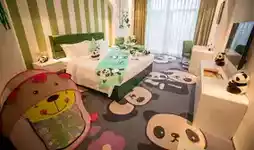 The panda-themed room we booked felt like stepping into a bamboo forest retreat. The walls were adorned with playful panda murals, the bed was decorated with round panda cushions, and even the toothbrush cups and slippers had panda paw prints. The most delightful surprise was the spaciousness of the room—perfect for two adults and two kids. While the kids rolled around on the carpet with panda plush toys, my husband and I relaxed on the sofa, gazing at the circus lights through the floor-to-ceiling windows. It was the perfect remedy for the exhaustion of the past few days.