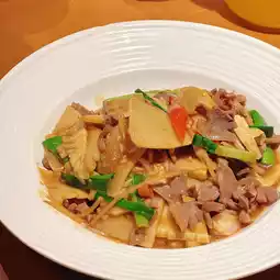 The restaurant is quite spacious with plenty of seating. Upon entering, you'll find a display of fresh ingredients and sample dishes on the right, reminiscent of a street food stall. The menu highlights seasonal favorites and recommended dishes. Service is quick, and we ordered several dishes. Most of them were delicious and paired well with rice, though the portions were not very large. Highly recommended dishes include Stir-fried Pork Intestines with Pickled Vegetables, Spicy Boiled Beef, and Farmer's Style Frog. They were all fresh and flavorful. The Ginger Fried Pork Ribs were also delightful, crispy, and aromatic.