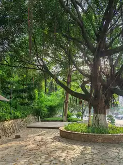 We entered Xiangyue Park just as the morning haze began to lift, the stone paths winding quietly between old banyan trees and granite outcrops 🌳🪨🌤️. The air was still cool, carrying the earthy scent of damp soil and fallen leaves. Locals practiced tai chi in shaded clearings, their slow movements matching the stillness of the park. Occasionally, the sound of birds broke the silence, their calls echoing softly between the rocks.