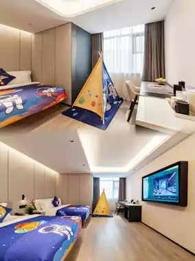 β Themed Family Rooms β Equipped with kids' tents, cartoon bedding, and a mini fridge, children will squeal with delight upon entering