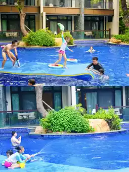 Kids go wild with water fights while parents relax on loungers capturing the fun 📸 (Ultra-high photo-worthy moments!)
