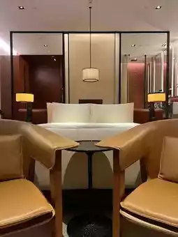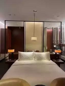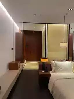 "Minimalist style" but warm: the big white bed is as soft as being wrapped in clouds, two amber-colored lamps by the headboard, lying in bed watching the green plants and light shadows outside the glass instantly makes you forget your deadline. The bathroom has frosted glass, and pulling the curtain isolates everything. The most thoughtful feature is the smart control—press a button and the curtains close automatically, a delight for social anxiety.