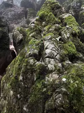 Even more delightful are the flowers hidden within the greenery. Some climb the cliff walls, blooming in clusters of pale purple spikes that sway gently in the wind; others lie in the grass, holding pink and white petals, especially fresh with morning dew; some shrubs bear tiny orange-yellow flowers, not as grand as peonies but possessing a natural mountain elegance. Ignoring the season, these flowers bloom freely in late autumn at Tianzhu Mountain, contrasting with the abundant green, as if all the vitality of spring and summer has been gathered and stored in this moment.