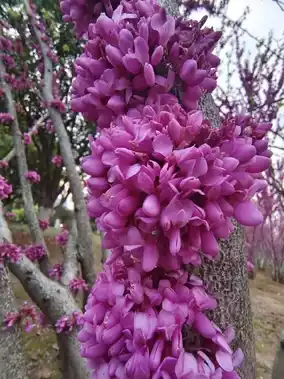 Carefully admiring this spring spectacle is like reading a poem blending strength and softness. The old branches are as vigorous as ancient ink strokes, with cracked textures hiding traces of time, yet defying convention by suddenly bursting into clusters of purplish-red butterfly-shaped flowers on the bare branches and even the main trunk. The petals are as thin as cicada wings, like silk dyed with rouge; when slightly open, they reveal two playful upward-curving flag petals, resembling pink butterflies ready to take flight. Crowded closely together, they wrap the dark branches into a flowing cloud of rosy hues. From afar, it looks as if the weathered ancient tree is dressed in a jeweled gown, exuding stunning vigor and passionate silence.