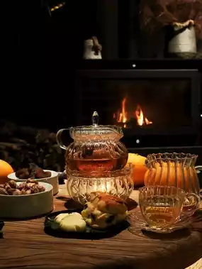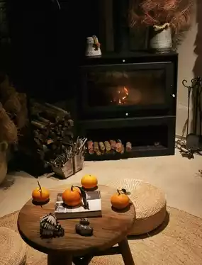 There is a tea-making area and a fireplace on the first floor.