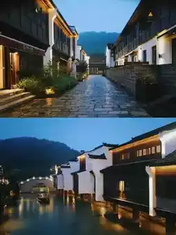 Walking along the winding cobblestone paths, you'll find classical-style buildings on both sides—white walls with dark tiles, rustic wooden doors slightly ajar, and lanterns hanging under upturned eaves, exuding the charm of a typical water town.