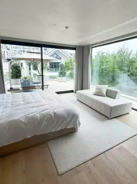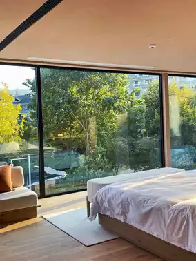 The sun shines through the glass and shines on the bed, enough to be gentle all day