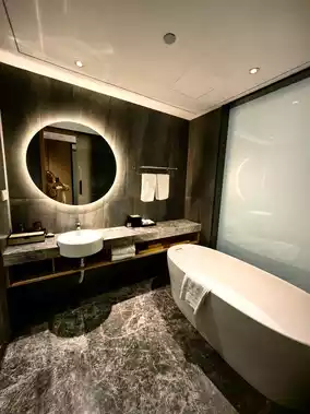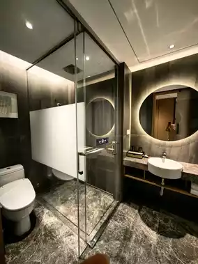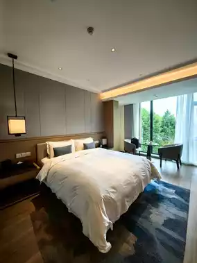 🧩Our room was about 25-30 square meters, clean and tidy with good hygiene. The 1.8-meter-wide bed was very comfortable to sleep in. The bathroom had both a bathtub and a shower with plenty of hot water. The toilet was smart, and besides a mini-fridge, there was even a sterilization cabinet in the room. The view from the floor-to-ceiling windows was utterly charming. The mountains outside were misty, and the room was cozy and warm.