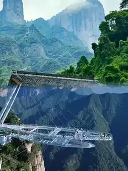 An Internet-famous landmark! The glass bridge spans the canyon and is shaped like a jade Ruyi. When the clouds and mist are lingering, it is like walking in the clouds, meaning "everything goes smoothly." A must-take photo spot.