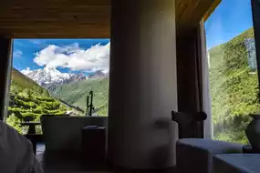 👉 With 270° panoramic floor-to-ceiling windows facing Mount Siguniang's Yaomei Peak, open the window to a lush summer scene where pristine forests and snowy mountains intertwine! Watch the sea of clouds flow beneath your feet, sunlight streaming through pine trees into your room. From your bed, enjoy a triple paradise of "snowy peaks, forest seas, and alpine meadows."
