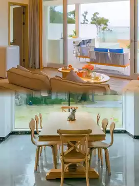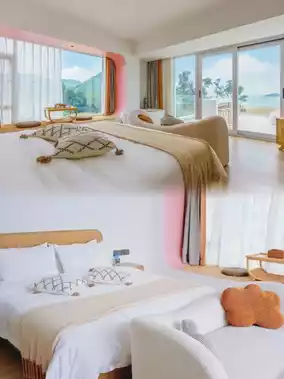From a distance, the homestay looks like a beautiful white castle surrounded by greenery, beaches, and the sea. Inside, the rooms are full of aesthetic design, and every detail shows exquisite care. The rooms are warm and comfortable, with a faint ocean atmosphere. Lying on the soft bed, you can hear the gentle whispers of the waves, lulling you to sleep. In the morning, open the curtains, and the romantic sunrise over the sea will come into view, instantly making you feel relaxed and happy. You can enjoy the beautiful sea view from the bed.