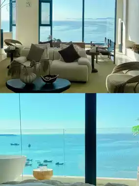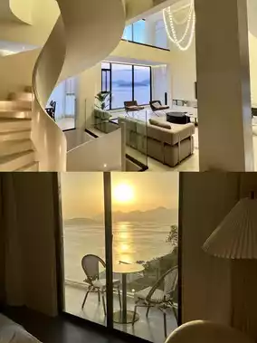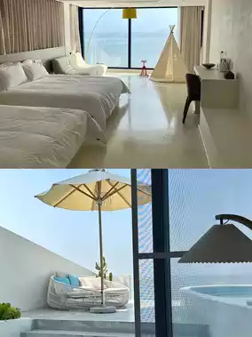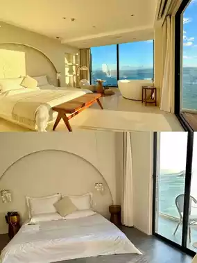 🌈The sea view is amazing, open the curtains and you can see the beautiful sea🌊, the room is decorated in a Greek style, full of Instagram style, the interior is very clean and tidy, and the design is full of style, especially the chandelier🔮 and spiral staircase in the lobby, which are stunning when lit up at night, and there is a huge swimming pool🏊🏻 next to it, which is very photogenic📸!