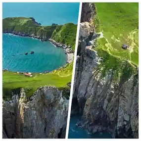 Highlights: Cliffside fishing village where sunset paints the sea, with boat silhouettes;