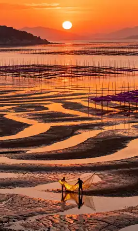 🔹Tidal Flat Light and Shadow Feast: Sunrise on the Beiqi Tidal Flats (golden silhouettes of fishermen casting their nets), Sunset on the Dongbi Tidal Flats (warm orange painting of returning fishing boats)
