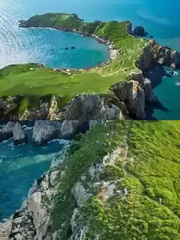 · Features: 90-degree vertical cliffs, crescent-shaped island, lush green lawns