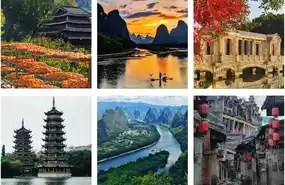 Duxiu Peak, Li River, Two Rivers and Four Lakes, Longji Terraces, White Moon Twin Towers, Peach Blossom Source, Elephant Trunk Hill, Diecai Hill, East and West Alleys