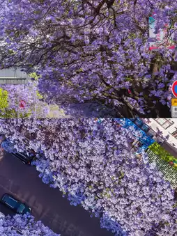 The Jacaranda on this street is extremely lush, and it is relatively niche, not many tourists know about it. Drones are allowed on this street, so aerial shots of the Jacaranda street scene are the best!